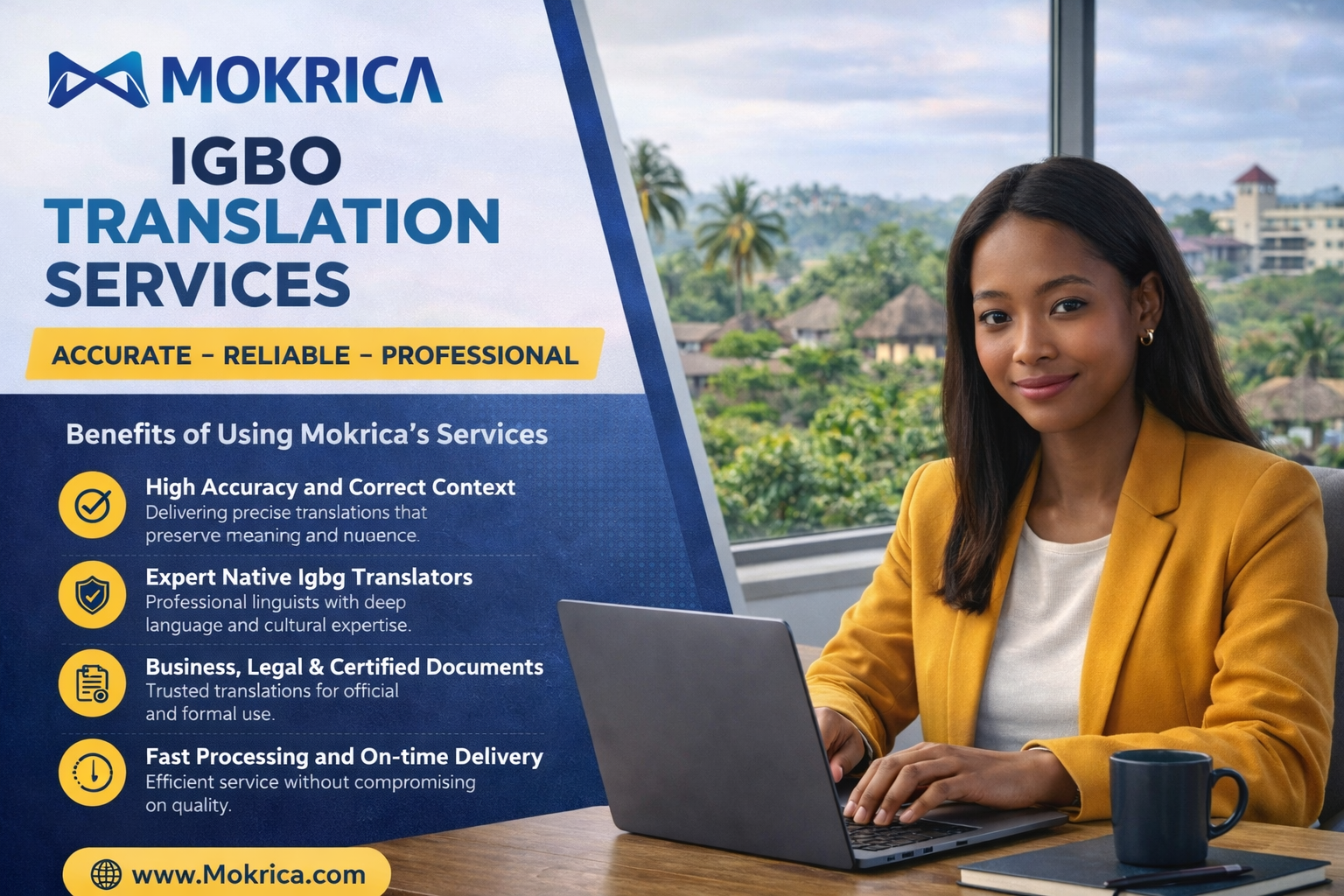 Mokrica cung cấp dịch vụ dịch thuật tiếng Igbo chuyên nghiệp, đáp ứng linh hoạt nhu cầu từ cá nhân đến tổ chức với quy trình minh bạch và chất lượng cao.