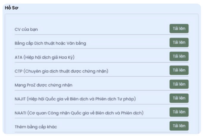 • Thông tin chưa đầy đủ hoặc thiếu chính xác: Hồ sơ cần bao gồm ảnh đại diện rõ ràng, họ tên đầy đủ, thông tin liên hệ, CV bằng tiếng Anh, cặp ngôn ngữ, và lĩnh vực chuyên môn.