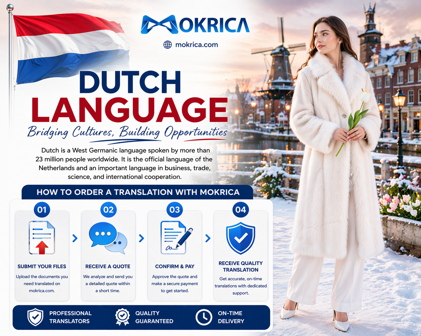 Dịch tiếng Hà Lan nhanh chóng, chính xác và đáng tin cậy cho nhu cầu học tập, làm việc và kinh doanh quốc tế. Mokrica cung cấp dịch tài liệu tiếng Hà Lan, dịch công chứng và dịch hồ sơ cá nhân, doanh nghiệp với đội ngũ biên dịch viên chuyên nghiệp. Hỗ trợ báo giá nhanh và dịch thuật theo tiêu chuẩn quốc tế. Dịch NgayDịch tiếng Hà Lan chuyên nghiệp – Rõ ràng, chính xác, phù hợp ngữ cảnh
